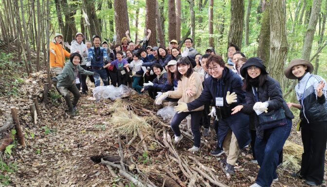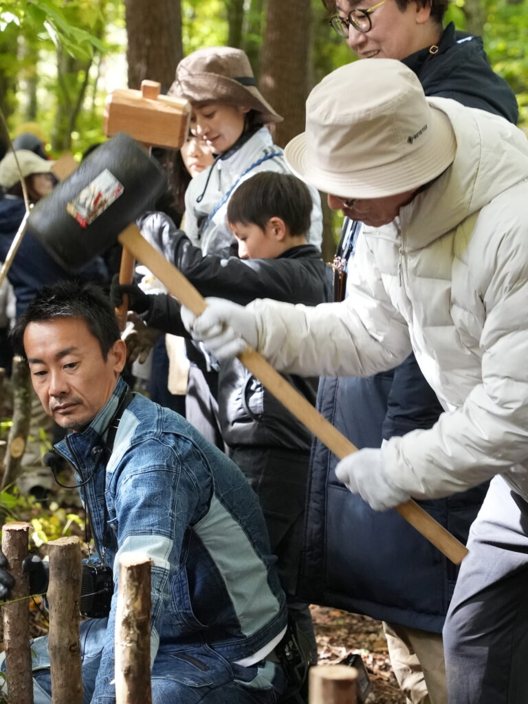 土中環境を再生する土木による森の水脈再生では、落ち葉を処方して「地球のスキンケア」、雑木杭を打って「地球の血流改善」。