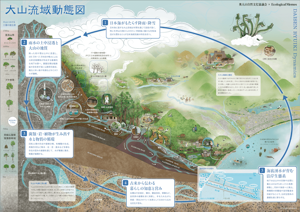 Ryuikiとは、ジオスケールでの地形生成から、土地に伝承される文化・信仰・神話、現在にいたる人の暮らしや経済まで多層的な時空間が積み重なる場(フィールド)の最小単位と捉え、その動態を感受するための身体性や視座を「流域動態感受性/RYUIKI Awareness」と呼んでいます。